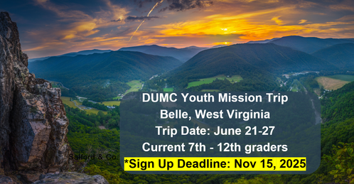 DUMC Youth Ministries is a place where students in grades 7-12 can come to learn about the Christian faith, develop and strengthen that faith, learn how to become loving, learning, and active followers of Jesus, hang out, and have fun. We strive to provide a solid Biblical foundation upon which our youth can grow into devoted men and women of God.